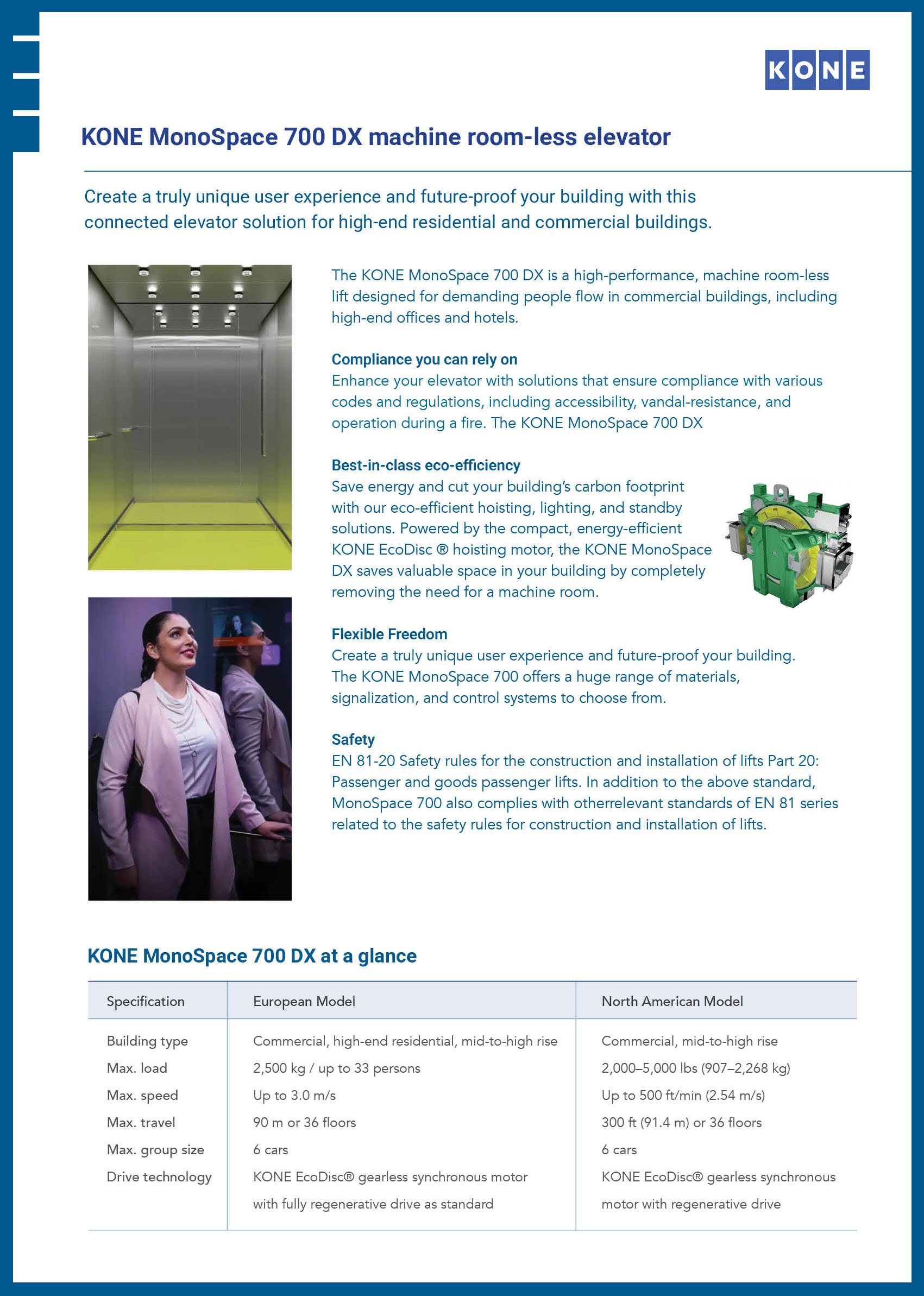 For this project I created a two-page specification sheet for KONE, a global leader in elevators and escalators. The aim was to present the MonoSpace 700 DX, a premium machine-room-less elevator, in a clear and engaging format suitable for both technical and marketing purposes.