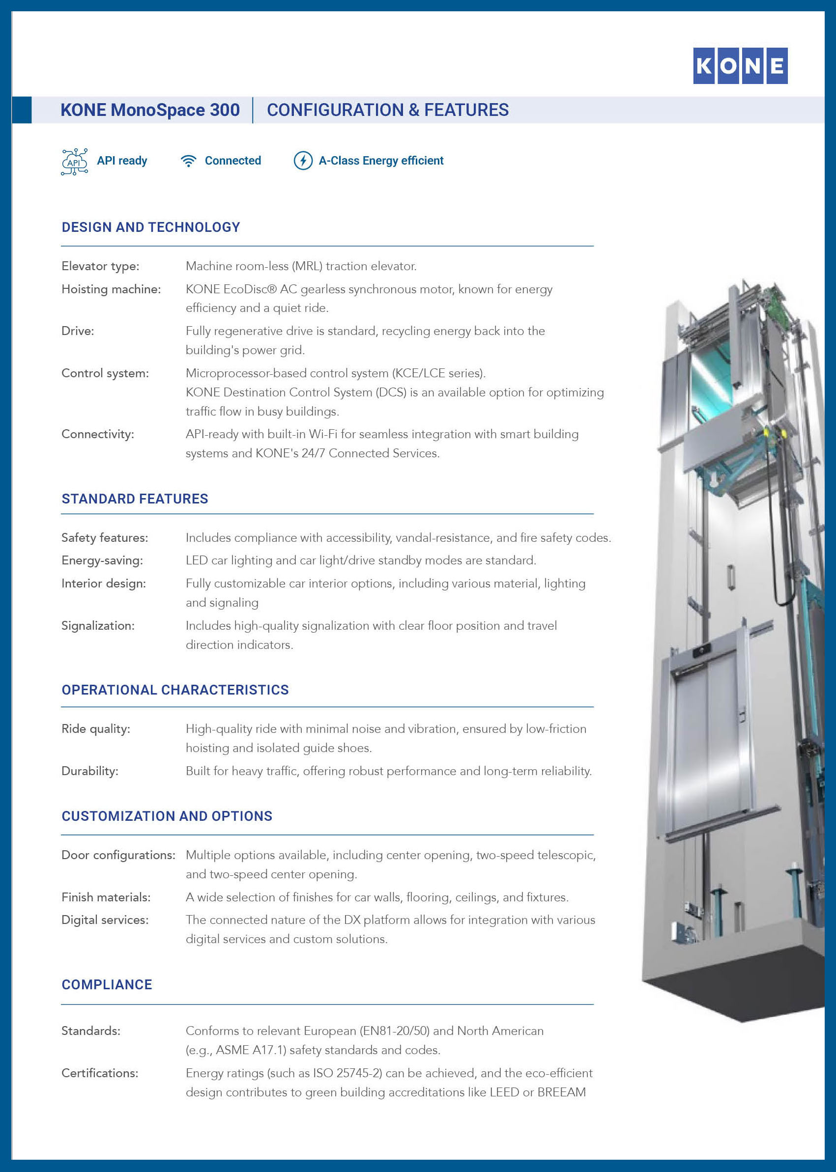 The design uses KONE’s brand colours and typography cues with a clean layout to balance imagery with structured technical data, highlighting key benefits and configuration.